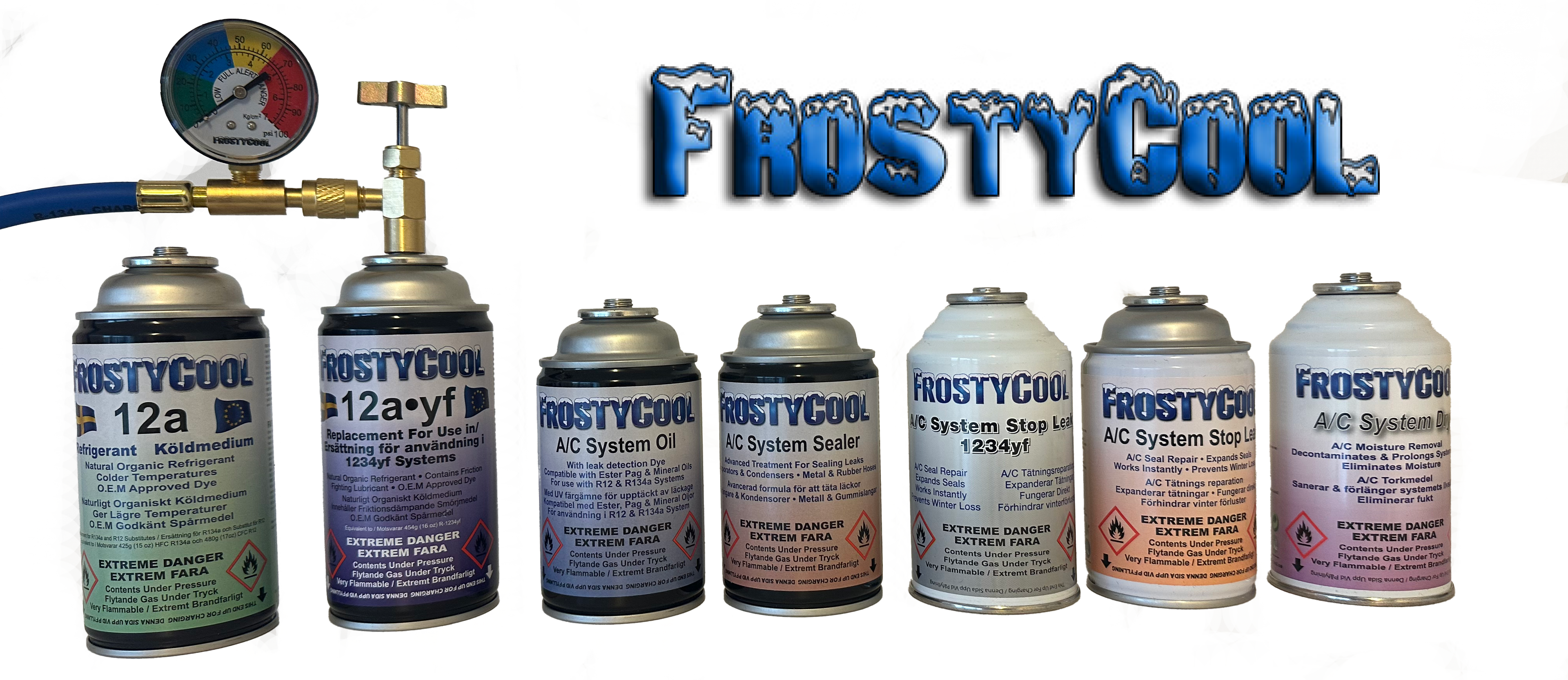 FrostyCool A/C system Sealer er beregnet for reparasjon av lekkasjer i kondensatorer, fordamper, rør og koblinger. Dette er et epoksybasert produkt som reagerer med fuktighet. Hvis ikke systemet har blitt evakuert med vakuum, bør FrostyCool A/C system Dry brukes før du fyller på med FrostyCool A/C system Sealer.